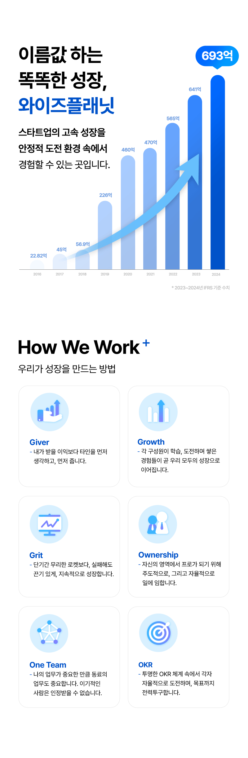 · 경영지원실은 재무회계, 인사, 총무 각 영역을 책임지며, 구성원들이 일의 의미와 재미를 느끼는 성장 환경을 만드는 것을 중요한 목표로 삼고 있어요. 와이즈의 핵심가치인 고객만족, 학습, 소통과 배려를 가장 앞서 실천하고자 하는 팀이며, 새로운 도전을 즐기고 팀의 성장을 함께 만들어가는 분위기를 지향합니다. 합류하신다면 혼자가 아니라, 동료들과 함께 공동의 목표를 향해 즐겁게 나아가는 경험을 하실 수 있어요. 도전을 두려워하지 않고 팀과 함께 한 단계씩 성장하는 과정을 즐길 수 있는 분이라면, 우리 팀에서 특별한 시너지를 만들어보실 수 있을 것입니다.