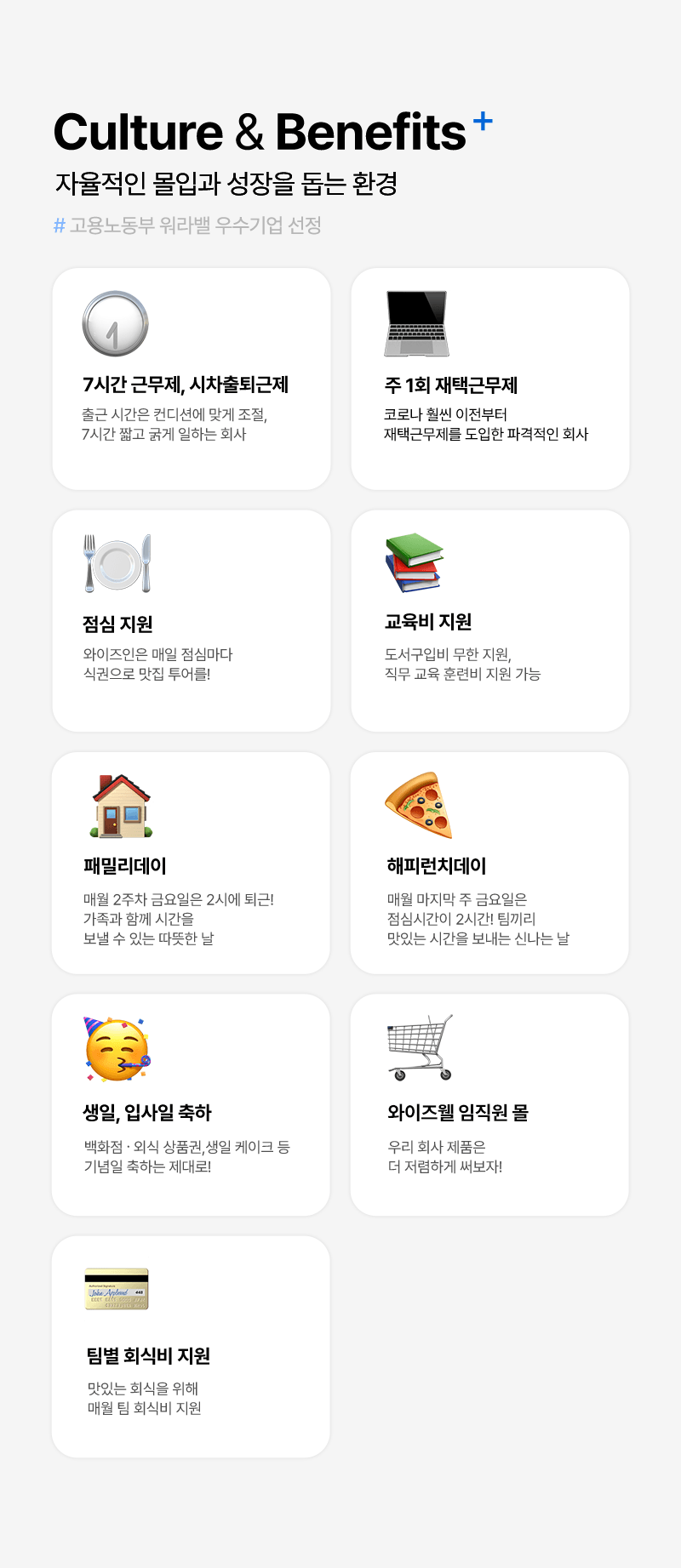 · 월~금 (주 5일), 09:00 ~ 17:00 (7시간 근무제)